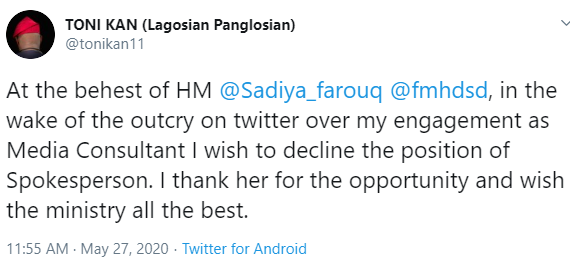 Writer and media executive, Toni Kan, has declined his appointment as the spokesperson of the Minister of Humanitarian Affairs, Disaster Management and Social Development, Sadiya Umar Farouq.