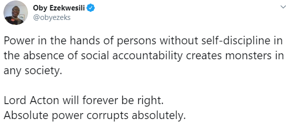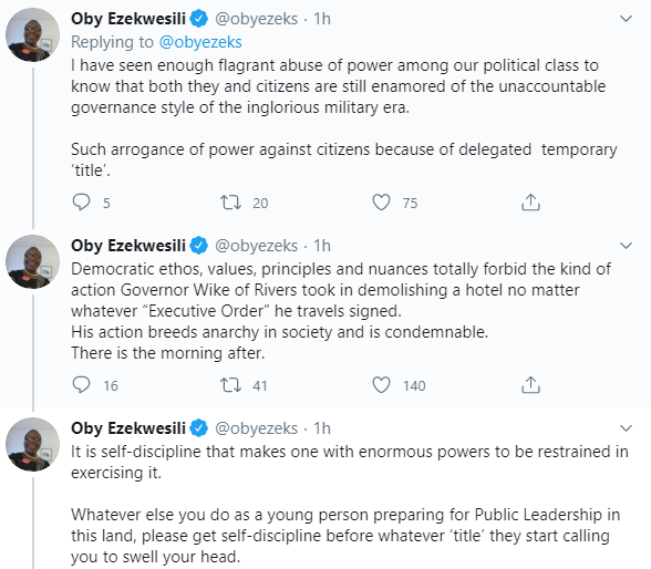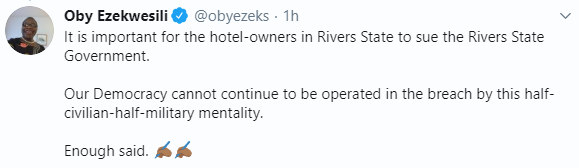 Commenting on the matter in a series of tweets, Ezekwesili said the governor lacked leadership discipline and urged hoteliers in the state to drag him to court.