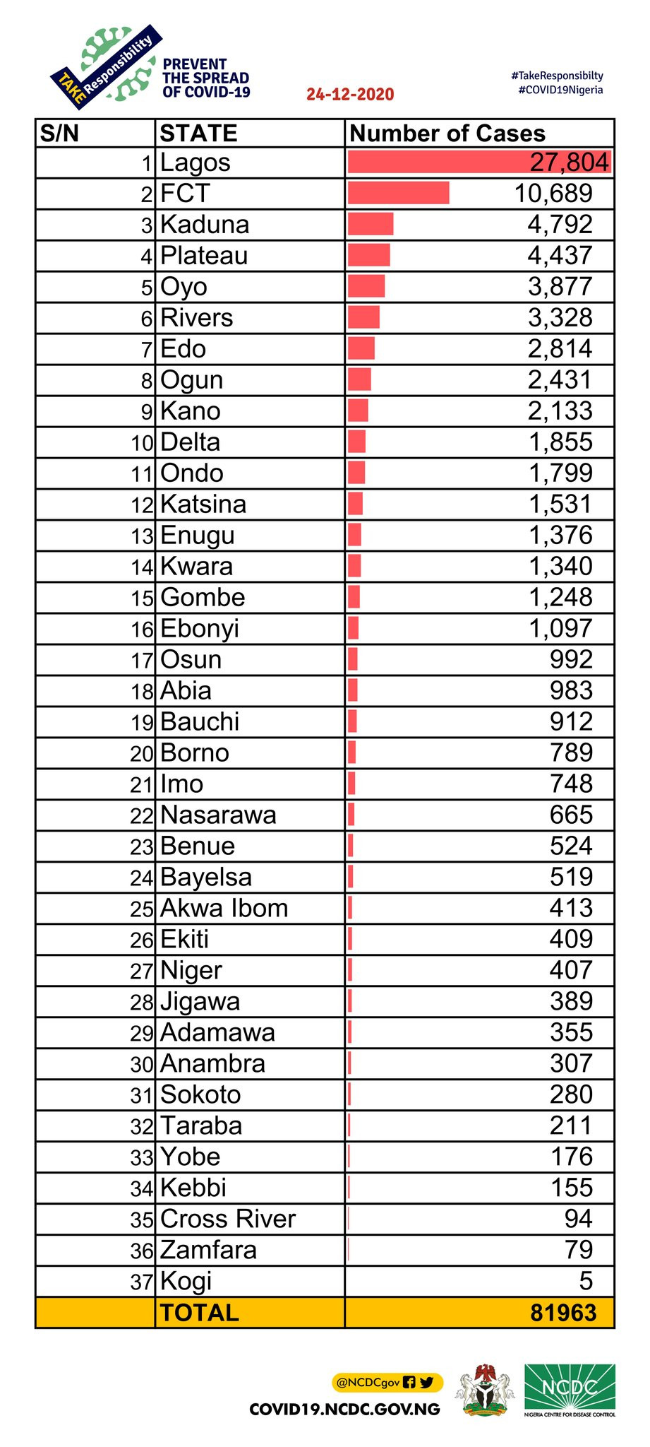 The Nigeria Centre for Disease Control said of the 1,041 cases recorded on Thursday, Lagos has 316; FCT-210, Kaduna-83, Plateau-70, Gombe-56, Oyo-56, Katsina-47, Nasarawa-35, Kano-33, Ogun-21, Rivers-17, Niger-14, Imo-14, Delta-12, Kwara-12, Edo-12, Benue-9, Anambra-8, Taraba-4, Ekiti-4, Ebonyi-6, Bayelsa-1, Sokoto-1.