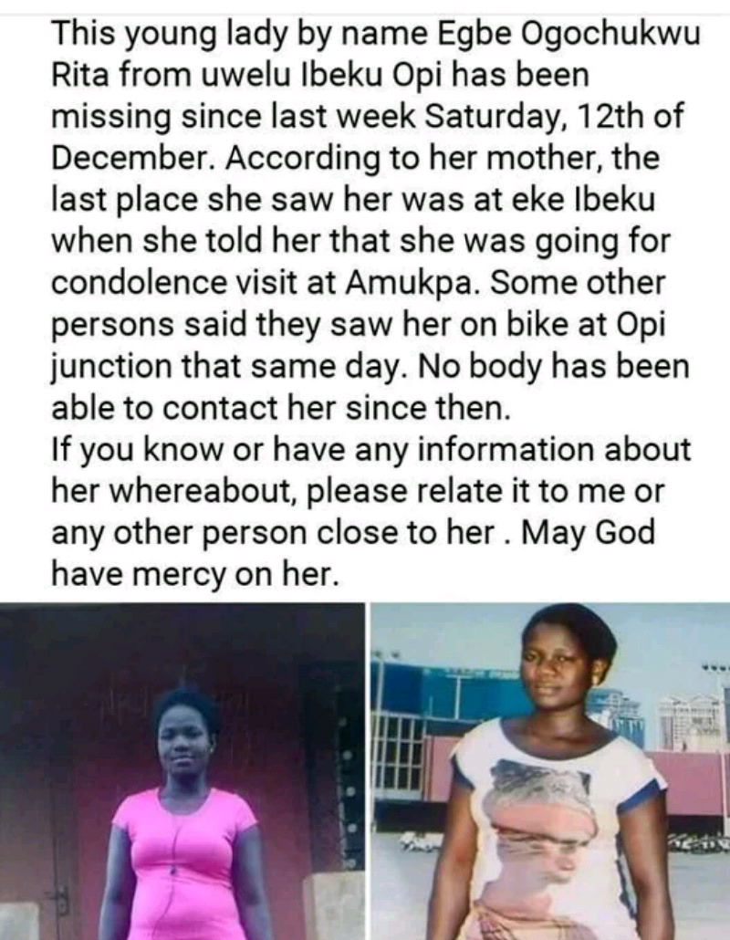 Rita was initially declared missing at Uwelu-Ibeku in Opi Town, Nsukka Local Government Area of Enugu State.