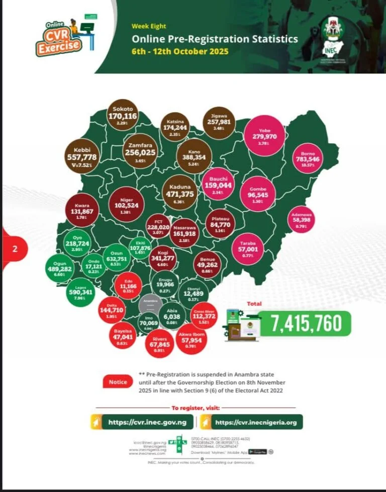 The Independent National Electoral Commission (INEC) says it has recorded a total of 7,415,760 online pre-registration in the ongoing nationwide Continuous Voter Registration (CVR) with Borno taking the lead with 783,546 registrants.