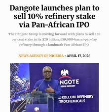 The Dangote Group is moving forward with plans to sell a 10 per cent stake in its 20 billion dollars , 650,000-barrel-per-day refinery through a landmark Pan-African Initial Public Offering (IPO) in 2026.